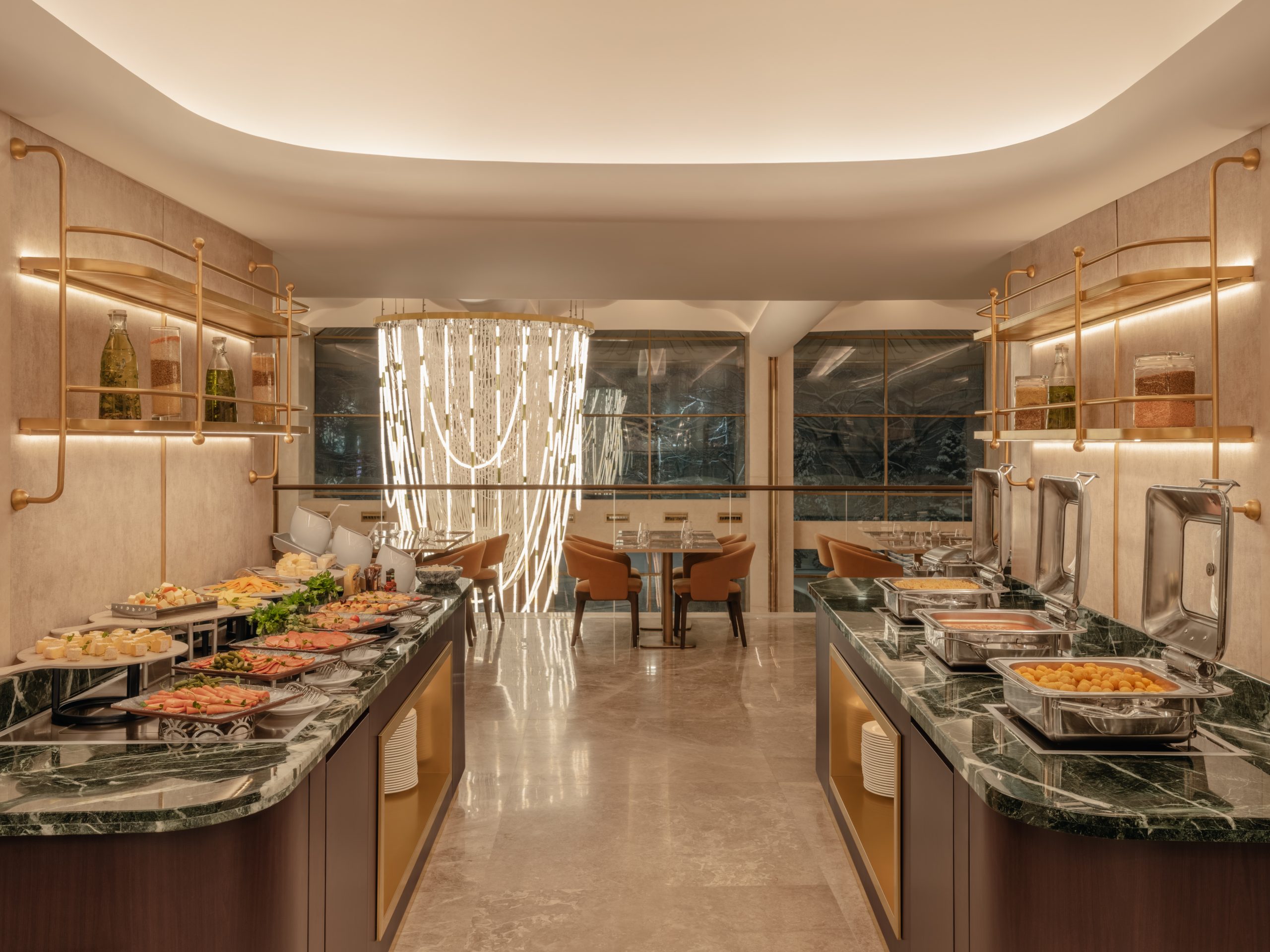 Гостям предлагают разнообразный выбор блюд, включая горячее, холодное, выпечку и напитки.